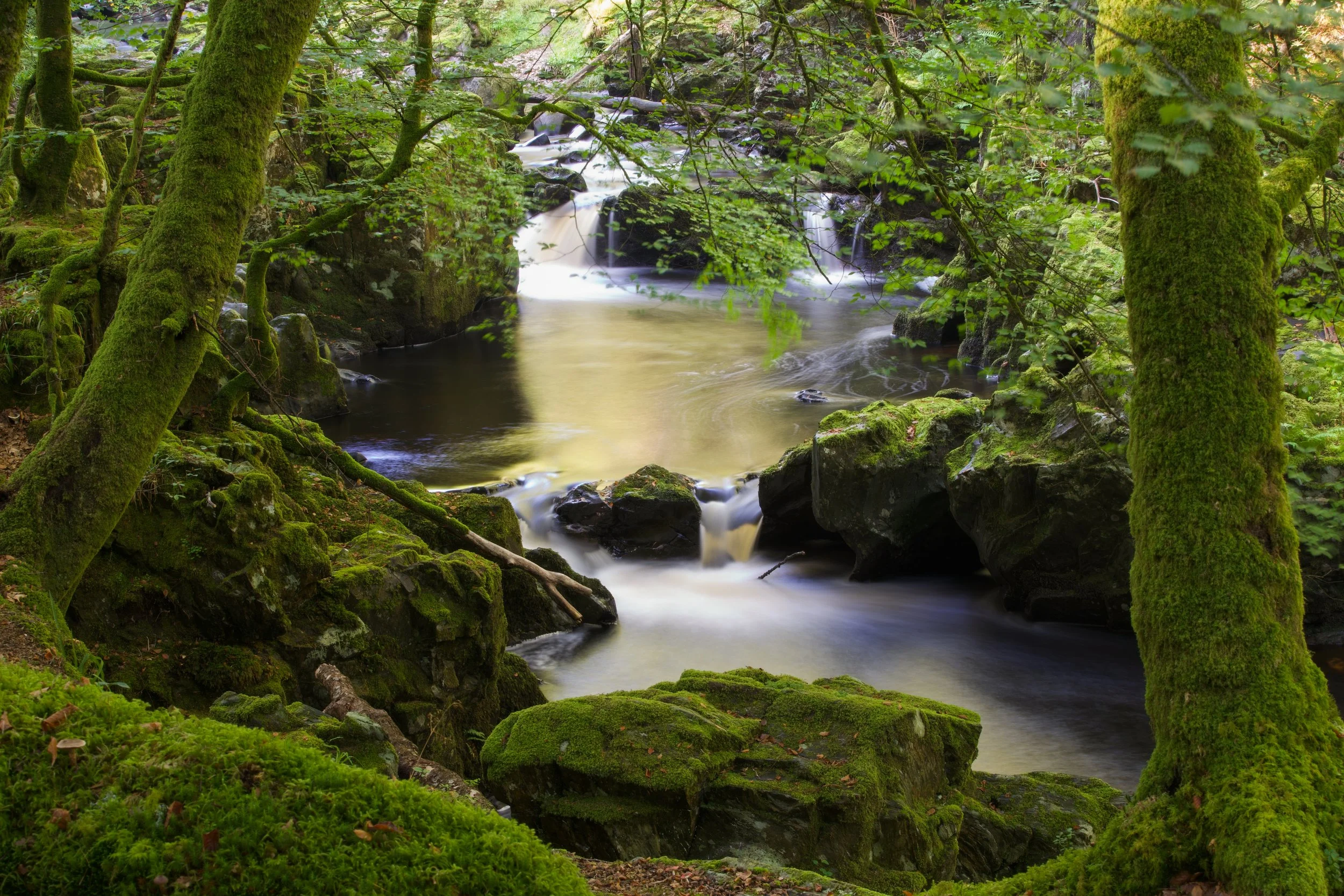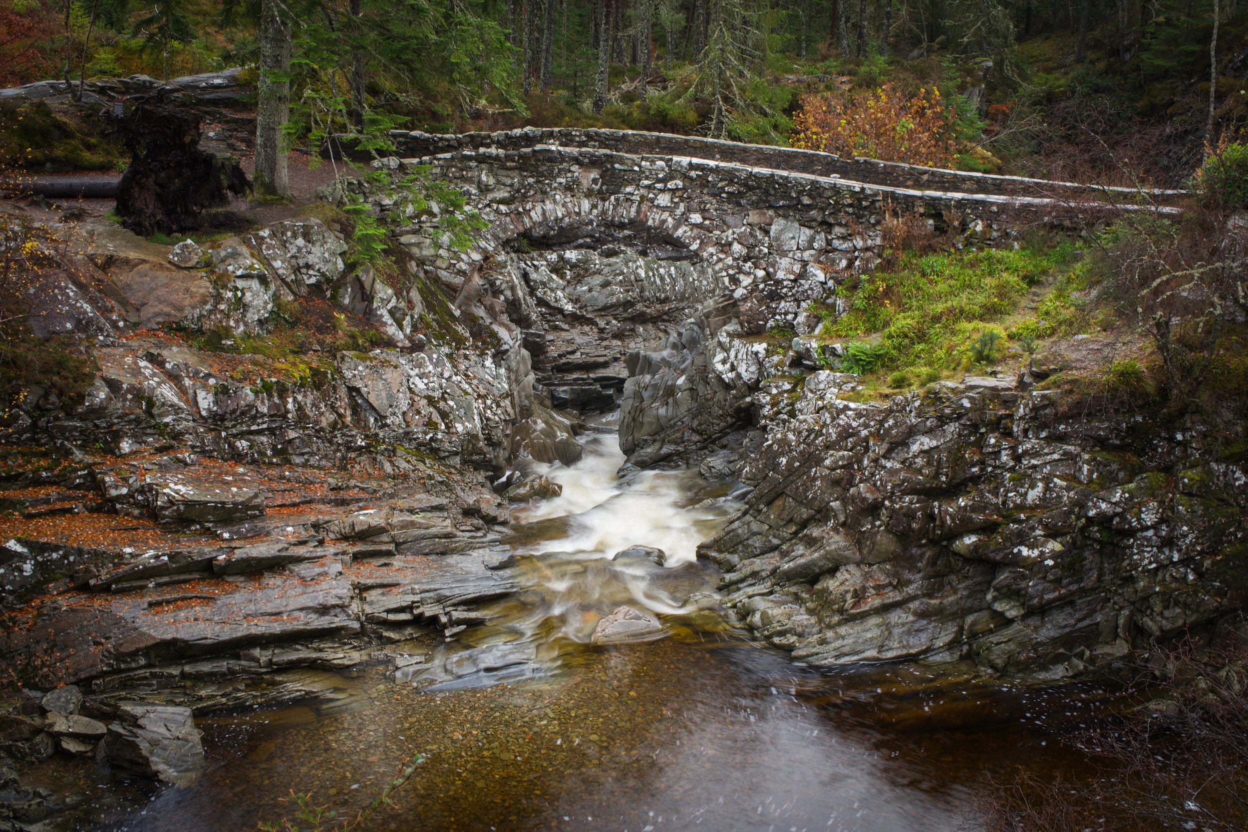 A waterfall walk that starts in Comrie at the small car park signposted Glen Lednock, a narrow wooded track will take you slowly towards the river, which you’ll hear getting closer and closer. Quite quickly you’ll come to the first waterfall, known as the Wee Cauldron. A viewing platform with a bench provides the perfect location for enjoying this. There are a series of smaller waterfalls just above, which form a pretty cascade of small pools.